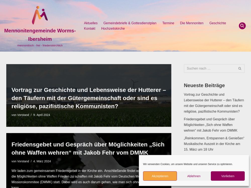 Wir sind eine Mennonitengemeinde, die seit über 350 Jahren vor Ort ist. Unsere rund 100 Mitglieder leben zum Teil in Worms-Ibersheim und Umgebung, insgesamt aber in einem weiteren Umkreis um die Gemeinde.Wir sind immer neu auf der Suche nach Wegen, um die Nachfolge Jesu zu leben. Wir laden herzlich dazu ein, uns kennen zu lernen.