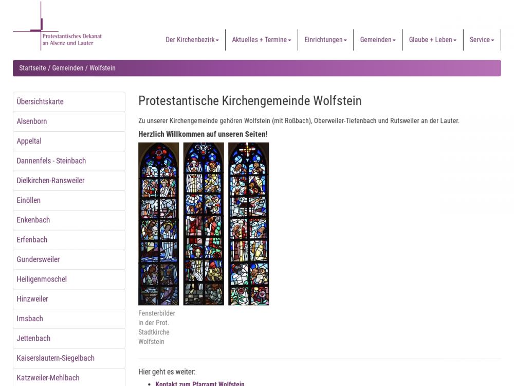 | Gottesdienst: | Wolfstein: jeden Sonntag 10 Uhr; Rutsweiler an der Lauter: jeden 2. Sonntag 9 Uhr; Oberweiler-Tiefenbach: jeden 2. Samstag 18 Uhr |