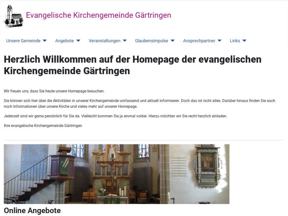 "Unsere Gemeinde ist ein von Jesu Liebe erfüllter, anziehender Ort, an dem Menschen durch die Begegnung mit Gott und miteinander Hilfe und Heil erfahren." - Leitspruch der evangelsichen Kirchengemeinde Gärtringen.Gottesdienste sind mit Chorälen und modernen Lobpreis-Liedern ansprechend gestaltet. Kindergottesdienst findet parallel im Gemeindehaus statt (außer in den Ferien)