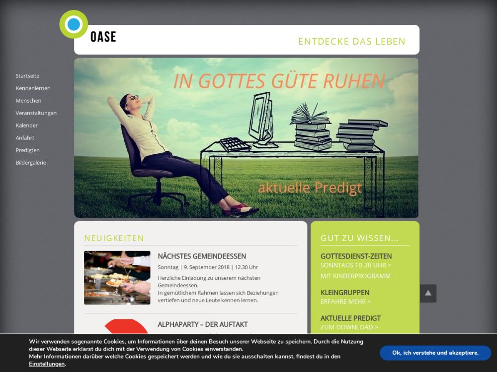Die „Oase“ ist eine evangelische Freikirche mitten in Waiblingen. Als Christen wollen wir eine Gemeinschaft sein, in der Gottes Wort unser Leben positiv verändert. In unseren Gottesdiensten soll es Menschen leicht gemacht werden, Erfahrungen mit der Gegenwart Gottes zu machen und Impulse für ihren Alltag mitzunehmen. Darum predigen wir nicht nur für den Sonntag, sondern für die ganze Woche. Mit moderner Musik und Instrumenten beten wir gemeinsam Gott an. Evangelisch sind wir, weil das Evangelium von Jesus Christus Maßstab unseres Gemeindelebens ist. Und wir sind eine Freikirche, weil unsere Gemeindebewegung organisatorisch nicht Teil der Landeskirchen ist, sondern auf unabhängige Weise ihr Gemeindeleben gestaltet und finanziert.Gemeinde-Info