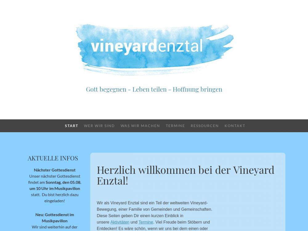 Wir als Vineyard Enztal sind ein Teil der weltweiten Vineyard-Bewegung, einer Familie von Gemeinden und Gemeinschaften. Unsere Vision ist es, Gott zu begegnen, Leben zu teilen und Hoffnung zu bringen. Unsere Gottesdienste sind sehr bunt und lebendig, da sich jeder mit seinen Gaben, Talenten und Stärken einbringen kann. Gott im Lobpreis zu begegnen ist uns besonderst wichtig - sowohl im Gottesdienst als auch in Lobpreisabenden. Seit einigen Jahren haben wir das Projekt "Kleiderstube". Hier können sich Bedürftige kostengünstig gebrauchte Kleidung einkaufen und bei Kaffee und Kuchen über Gott und die Welt ins Gespräch kommen.Mehr über uns erfährst Du auf unseer Homepage: