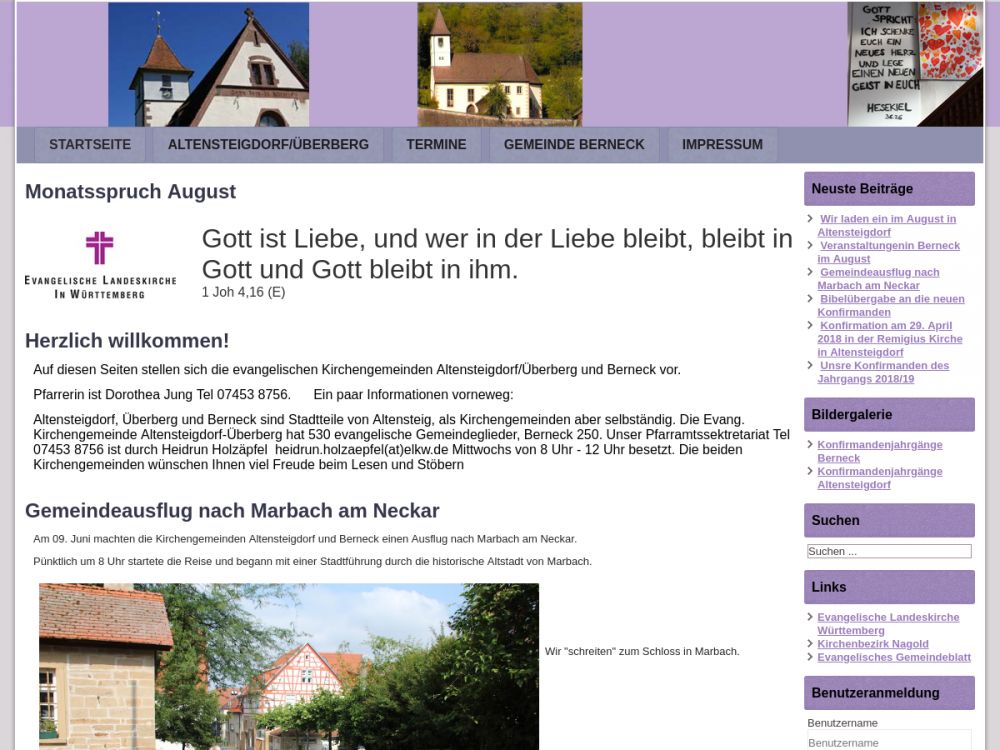 | Gottesdienst: | Sonntag, am 1. Sonntag im Monat: 9.15 Uhr in Lengenloch; andere Sonntage: 10.30 Uhr in Altensteigdorf |