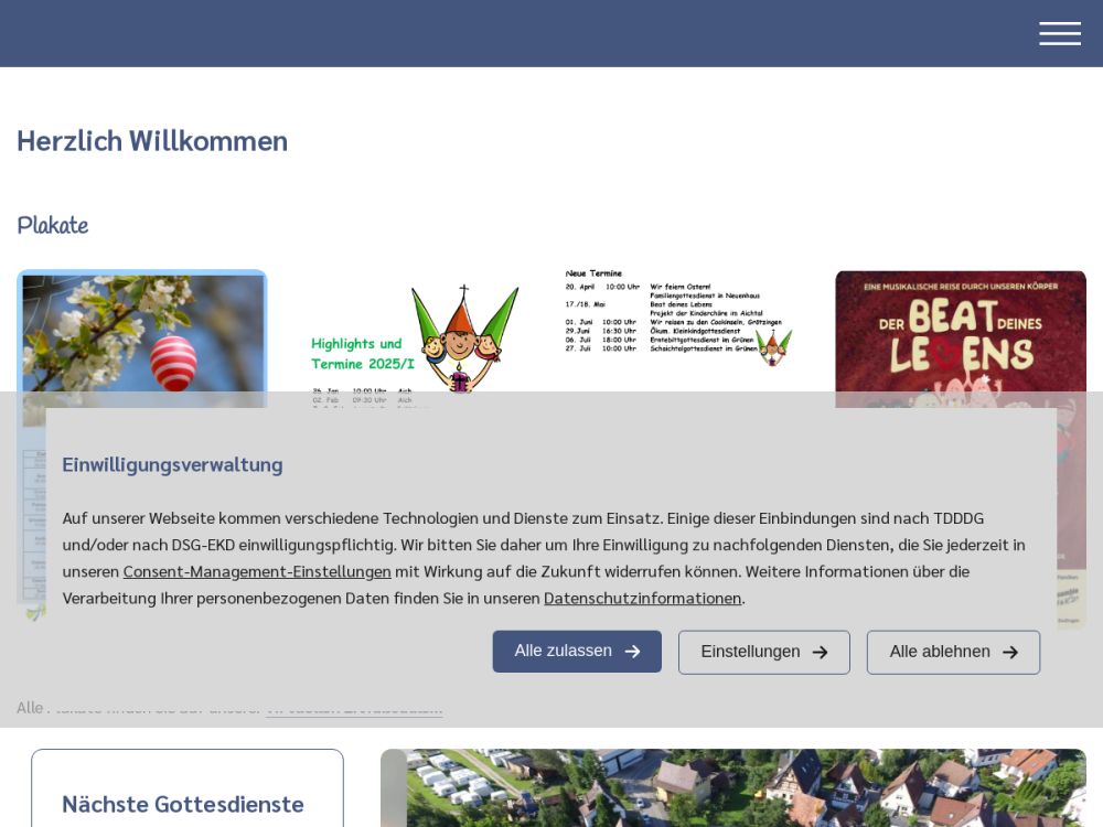 | Gottesdienst: | Sonntag - im Wechsel 09:30 Uhr in der Albanuskirche Aich oder 10:45 Uhr in der Evang. Kirche Neuenhaus |