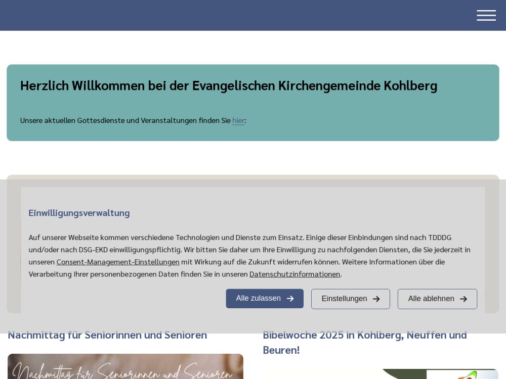 Unsere Evangelische Kirchengemeinde Kohlberg liegt am südlichen Rand des Kirchenbezirks Nürtingen, angrenzend an das Dekanat Bad Urach. Kohlberg ist eine von sieben Kirchengemeinden, die dem Distrikt 'Neuffener Tal' zugeordnet sind.Gemeinde-Info