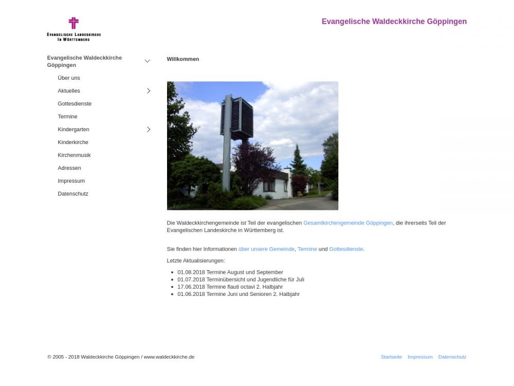 Die Waldeckkirchengemeinde ist Teil der evangelischen Gesamtkirchengemeinde Göppingen, die ihrerseits Teil der Evangelischen Landeskirche Württemberg ist. Zur Waldeckgemeinde gehören etwa 1000 Personen. Sie wird geleitet von Pfarrerin Christiane Waldvogel und dem Kirchengemeinderat. Die Gottesdienste am Sonntag feiern wir in verschiedenen Formen, als Familiengottesdienst, Abendmahlsgottesdienst oder einfach als Predigtgottesdienst. Unter der Woche finden Sie in unserer Gemeinde einen Kirchenchor, ein Blockflötenensemble, eine Krabbelgruppe, Jungschar, Jugendtreff, Seniorentreff, Tischtennisgruppe, Gymnastikgruppe und zwei Sprachgruppen.Gemeinde-Info