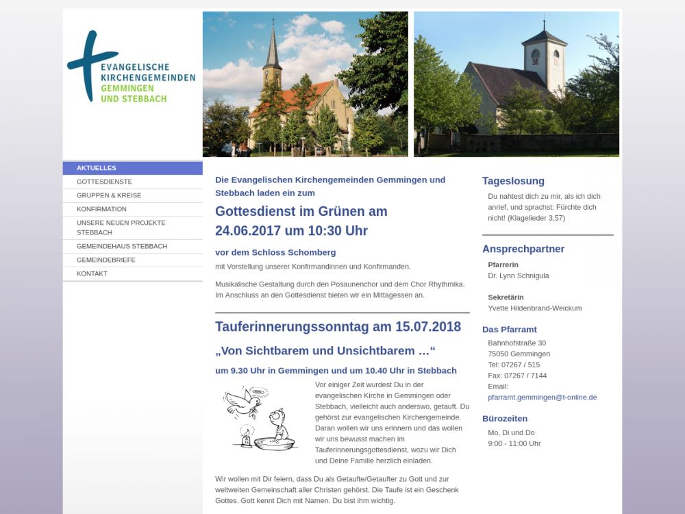 | Gottesdienst: | Jeden Sonntag in Gemmingen um 9:30 Uhr, in Stebbach um 10:40 Uhr |