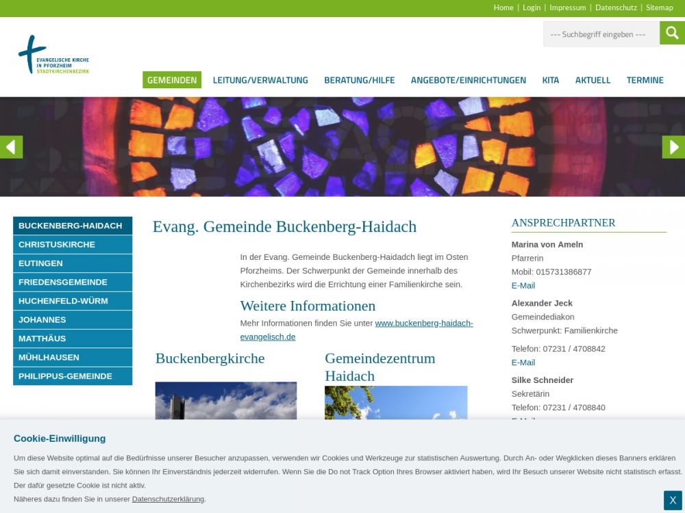 Die Evang. Gemeinde Buckenberg-Haidach ist eine Pfarrgemeinde der Evang. Kirche in Pforzheim. Sie hat das Profil der Familienkirche in Pforzheim. Zur Gemeinde gehören zwei Kirchen, die eine im Wohngebiet Haidach, die andere im Wohngebiet Buckenberg.Gemeinde-Info
