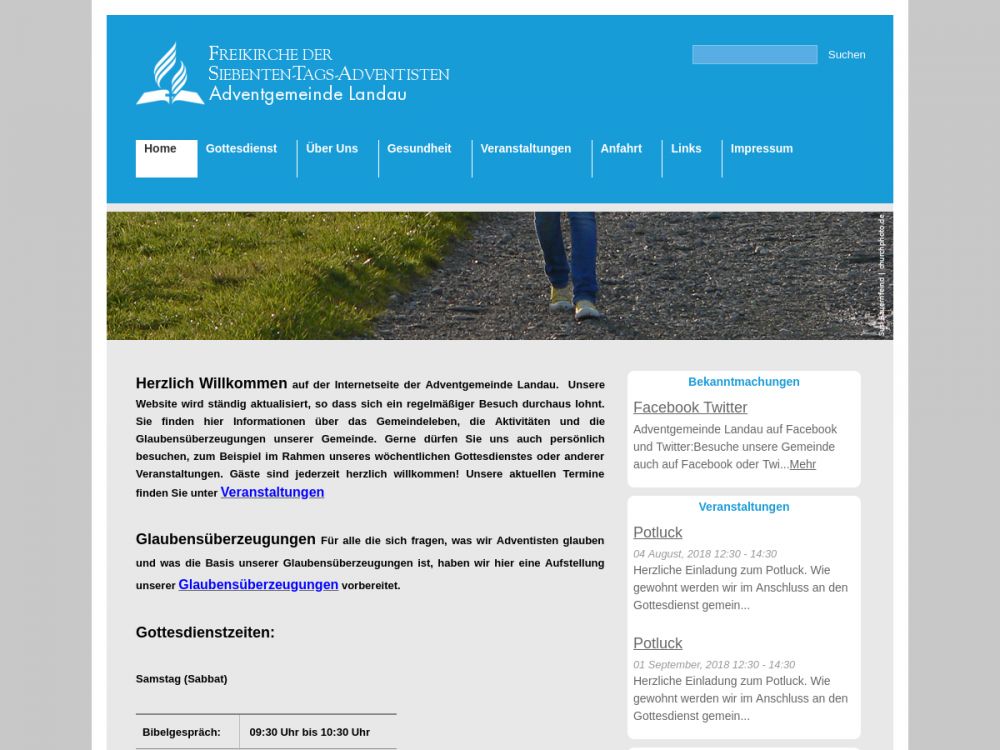 Die Adventgemeinde Landau ist eine Ortsgemeinde der Freikirche der Siebenten-Tags-Adventisten und ist Teil der Verwaltungseinheit der Mittelrheinischen Vereinigung. Diese Verwaltungseinheit umfasst die Gemeinden der Bundesländer Saarland, Hessen und Rheinland-Pfalz.Wir versammeln uns hier in Landau in den Räumlichkeiten der evangelischen Stadtmission Landau.