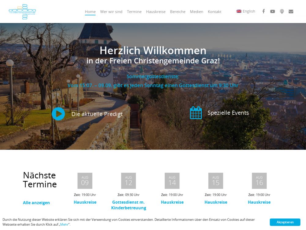 Wir sind eine lebendige Gemeinde in Graz mit einem vielfältigen Gemeindeleben. Neben speziellen Programmen für Kinder, Jugendliche, Studenten, Senioren gibt es eine Vielzahl an Angeboten in unserer Gemeinde. Jeden Sonntag finden 2 Gottesdienste um 9:30 Uhr und 11:30 Uhr statt! Unter der Woche gibt es zahlreiche Hauskreise an verschiedenen Orten! Jeder ist herzlich willkommen!!Gemeinde-Info