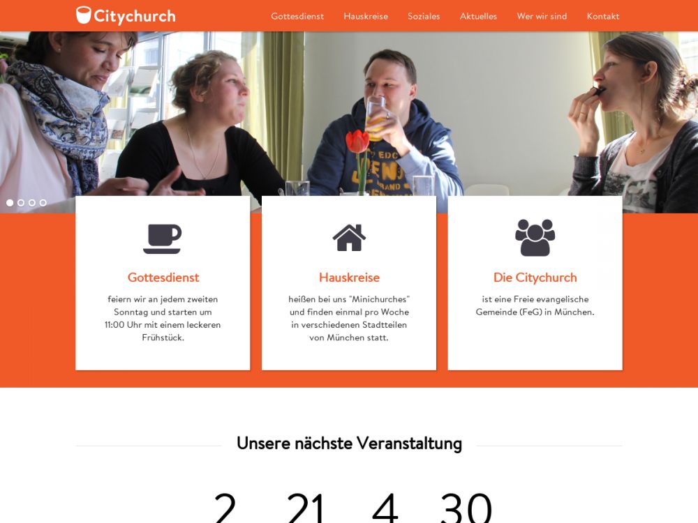 Die CityChurch München trifft sich im Herzen von München im Haus des Stiftens, Landshuter Allee 11.Wir beginnen unseren Gottesdienst mit einem gemeinsamen Frühstück, bei dem wir miteinander ins Gespräch kommen, die gemeinsame Zeit genießen und in der Begegnung miteinander auch Jesus begegnen wollen. Im zweiten Teil des Gottesdienstes haben wir im wesentlichen drei Elemente: Gemeinschaft, Musik und Predigt, bei der wir uns auf Jesus Christus konzentrieren und erfahren, wie der Glaube im Alltag Fuß fassen kann und umgesetzt werden kann.