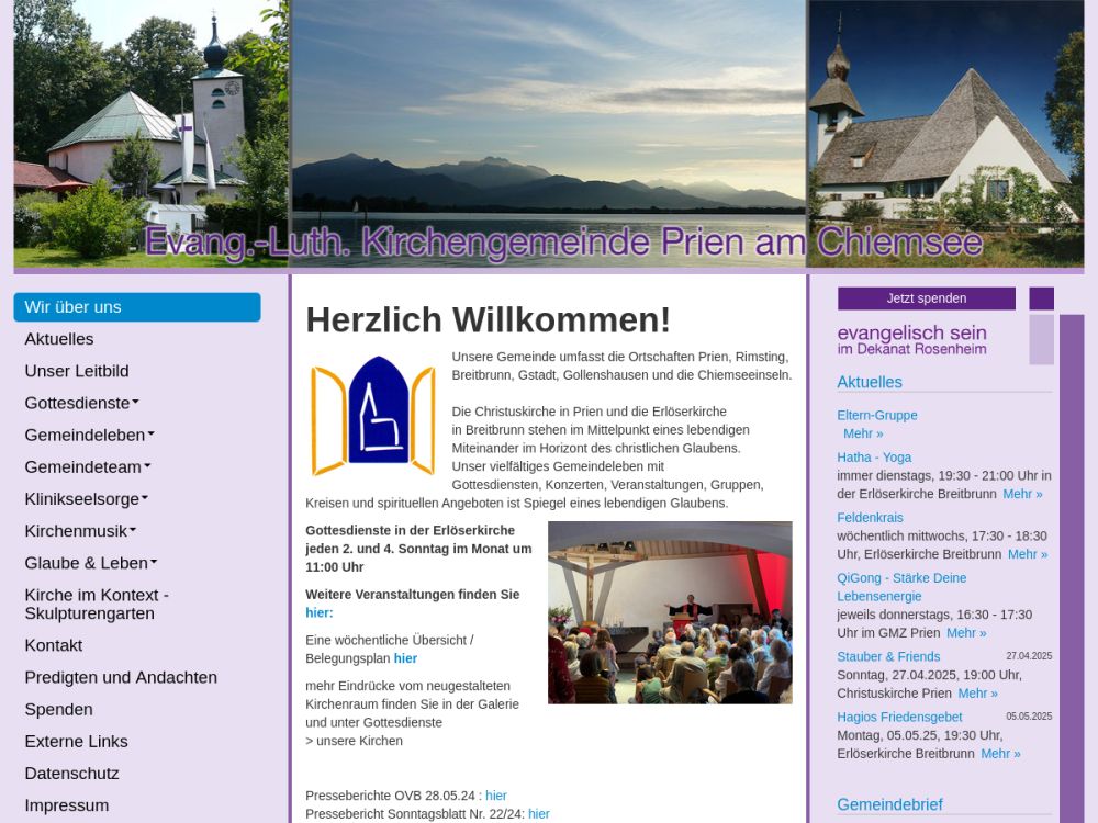 Die Gemeinde Prien am Chiemsee hat ca. 2900 Gemeindemitglieder und umfasst das Gebiet am Chiemsee von Prien über Rimsting, Breitbrunn, Gstadt bis Gollenshausen. Wir sind eine sehr lebendige Gemeinde mit den Schwerpunkten Musik sowie die Arbeit mit Kindern- und Jugendlichen. Auf unserem Kirchplatz in Prien befindet sich seit 2007 ein kretisches Labyrinth welches immer wieder an Festtagen in die spirituelle Gemeindearbeit einfließt.Gemeinde-Info