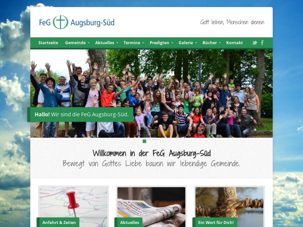 Die FeG Augsburg-Süd ist eine evangelische Freikirche im Augsburger Stadtteil Haunstetten. Unser Gottesdienst findet sonntags um 10 Uhr statt. Herzliche Einladung!Die Freie evangelische Gemeinde (FeG) Augsburg-Süd im Augsburger Ortsteil Haunstetten, ist eine von vier FeGs in Augsburg sowie eine von aktuell 440 Ortsgemeinden in ganz Deutschland.