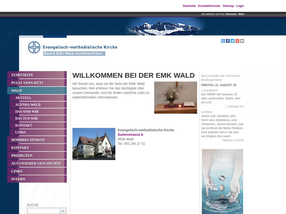 Die Evangelisch-methodistische Kirche (EMK) Wald ist eine christliche Gemeinde, zu der sich etwa 40 erwachsene Menschen zählen. Miteinander feiern und in unterschiedlichen Lebenslagen verbindlich für einander und für andere dasein – das kennzeichnet uns.Menschen überwiegend in der zweiten Lebenshälfte prägen unsere Gemeinde. Weil ältere Menschen jüngeren und jüngere Menschen älteren viel zu geben haben, und weil wir einander brauchen, sind bei uns alle herzlich willkommen. Auch Menschen, die in unserer Gesellschaft gerne übersehen und überhört werden, finden bei uns Platz. Wir pflegen und anerkennen die Vielfalt der Meinungen, Stile und Lebensentwürfe.
