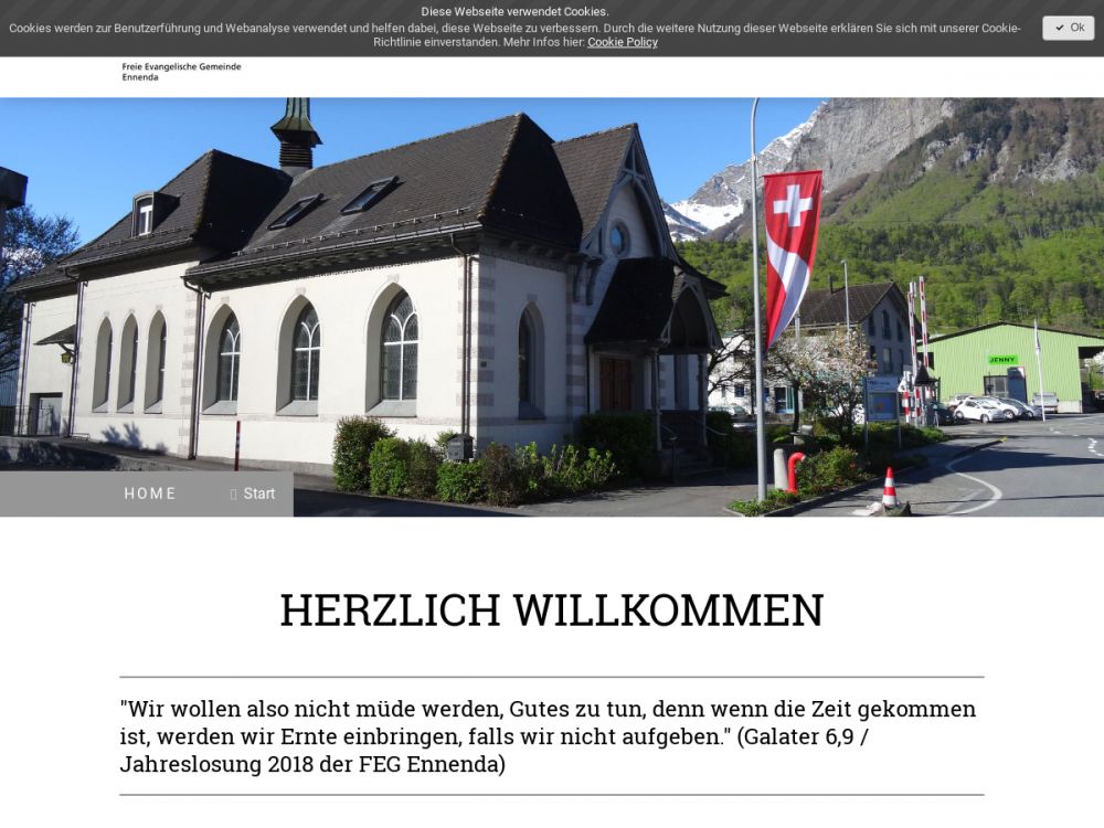 Die FEG Ennenda wurde 1885 gegründet und ist seit 1894 in einer eigenen Kapelle an der Hohlensteintrasse 7, in 8755 Ennenda (Schweiz, daheim. Obwohl die Gemeinde schon viele Jahre auf dem Buckel hat, sind die ca. 50 bis 80 Erwachsenen plus Kinder, die sich zu uns zählen alles andere als stur und festgefahren. Bei uns treffen sich Menschen jeden Alters. Unsere Hauptziele sind gemeinsam Gott anzubeten und uns dafür einzusetzen, dass weitere Menschen unseren Herrn Jesus Christus persönlich kennen lernen. Genau so wie Jesus sich das in Matthäus 28,18-20 wünscht.Wenn Sie mehr über uns erfahren möchten, dann freuen wir uns sehr, Ihnen persönlich zu begegnen. Unsere Homepage informiert sie was bei uns wann los ist: www.feg-ennenda.ch