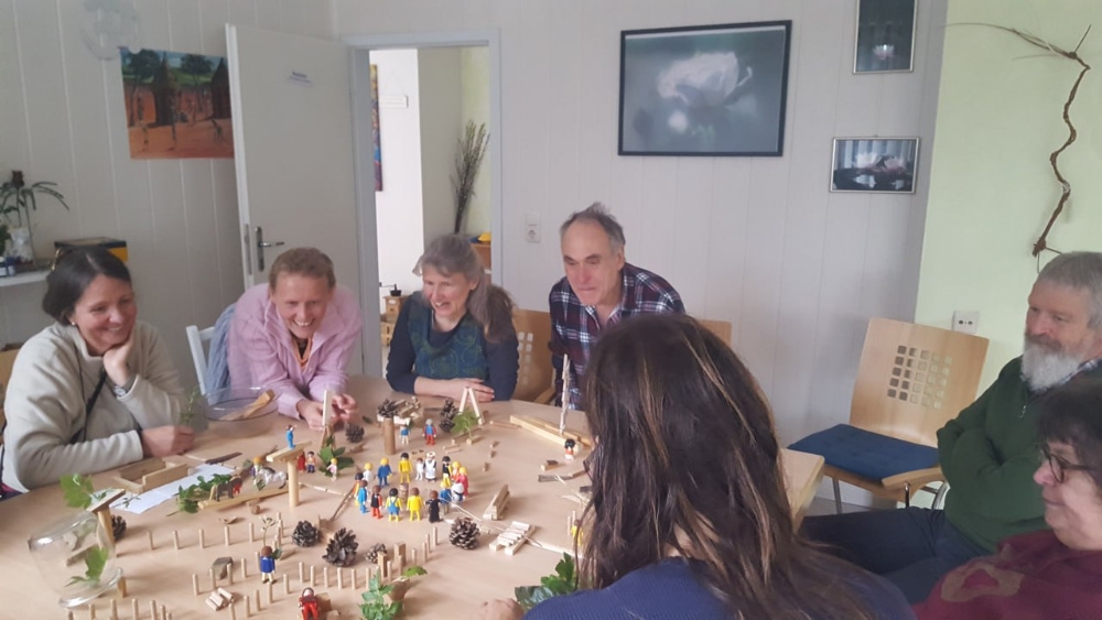 Frieden mit Gott und miteinander, zusammen singen und musizieren und uns gegenseitig ermutigen und erzählen was geholfen hat, zusammen helfen und was Schönes erschaffen und uns daran freuen. Bei schönem Wetter sind wir draußen im schönen Garten am Fluß.
