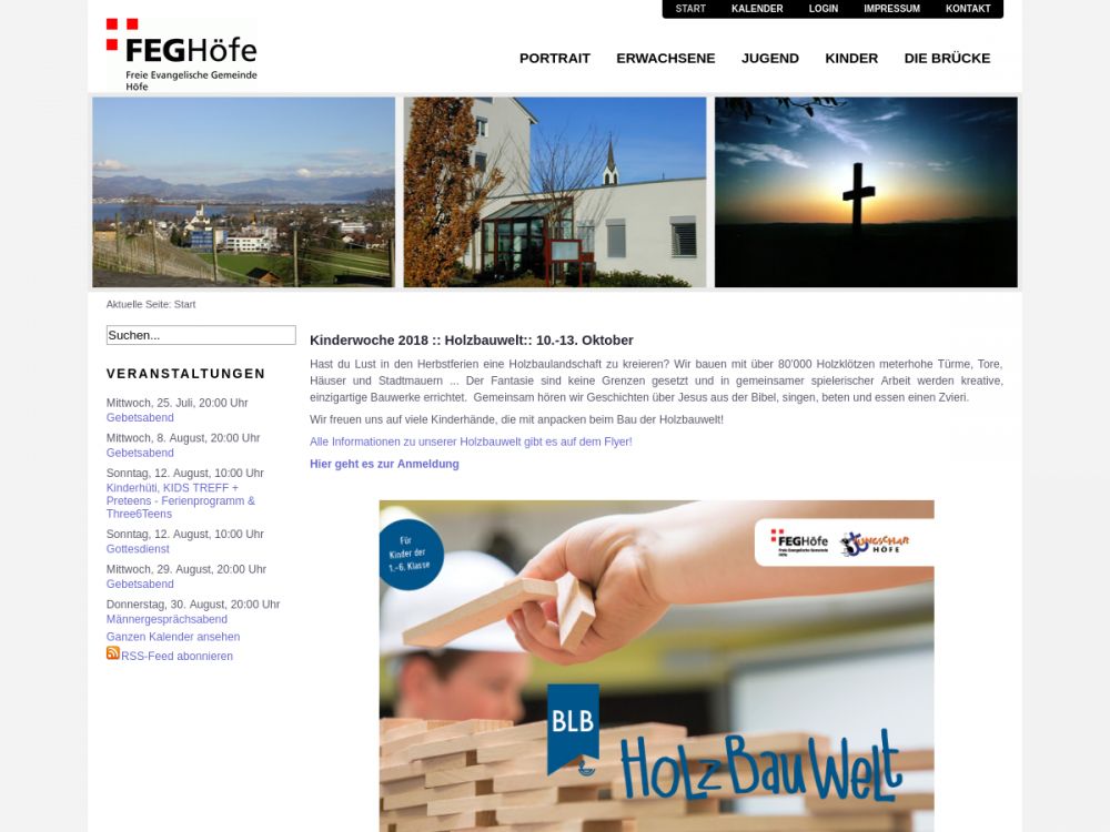 | Gottesdienst: | Sonntag 10:00 Uhr (ab 10.30 Uhr die Predigt im Livestream unter www.feg-hoefe.ch/live) |