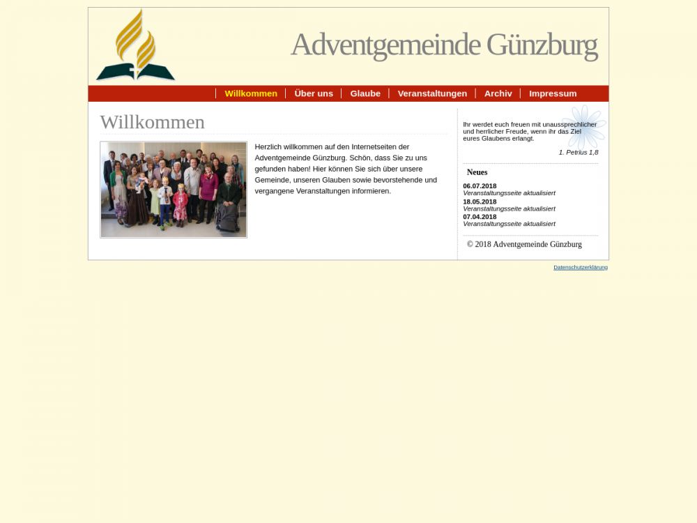 Wir, die Adventgemeinde Günzburg, sind eine kleine, engagierte Ortsgemeinde der weltweiten Freikirche der Siebenten-Tags-Adventisten.Wir treffen uns jeden Samstag (dem biblischen Sabbat) zum Gottesdienst um 10:00 Uhr. Der erste Teil beginnt mit gemeinsamem Gesang und anschließender Predigt. Im zweiten Teil (ab ca. 11:10 Uhr) findet ein Bibelgespräch statt. Auch an die Kinder ist gedacht: für sie gibt es in dieser Zeit altersgerechte Kindergruppen.