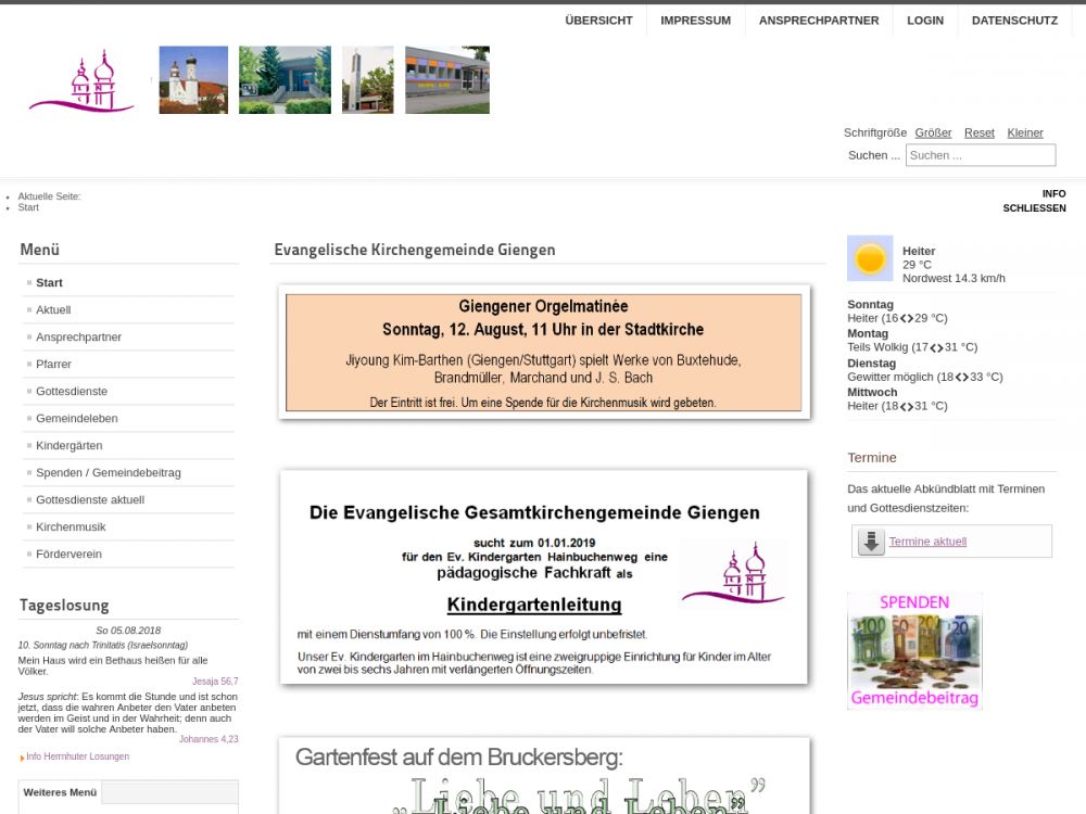 Die Evang. Kirchengemeinde Giengen ist eine lebendige und vielfältige Gemeinde mit engangierter Kirchenmusik (spätromantische symphonische Link-Orgel), Vesperkirche in Januar und Angeboten für jedes Alter.