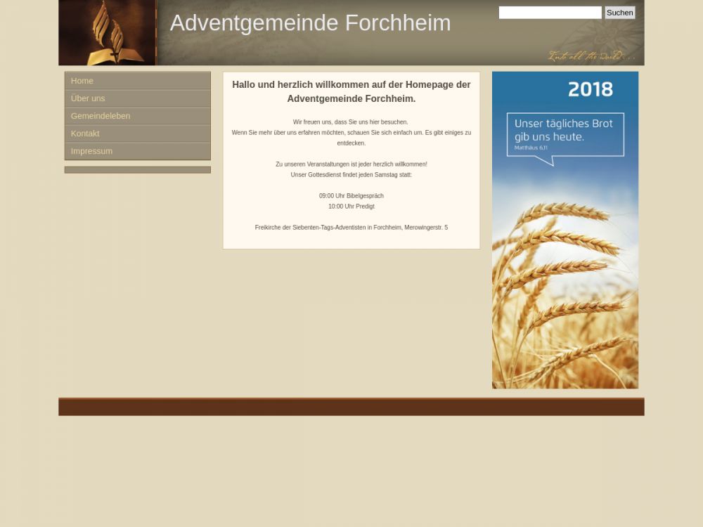 Die Adventgemeinde Forchheim der evangelischen Freikirche der Siebenten-Tags-Adventisten besteht seit 1948. In der familiären Atmosphäre und in den kleinen Gemeinderäumen sollen sich Gemeindeglieder und Gäste wohl fühlen. Liebevoller Umgang miteinander, Verständnis, Toleranz und Offenheit auch gegenüber Neuem werden daher groß geschrieben. Wir möchten Gott und unsere Gemeinde in Forchheim bekannt machen und freuen uns, wenn jemand unsere Gemeinde besucht. Gäste sind uns immer herzlich willkommen, denn unsere Türe steht jedem offen.Gemeinde-Info