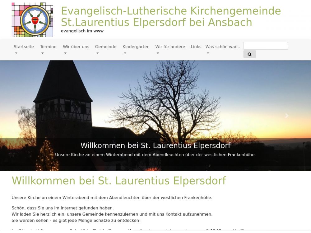 Die Kirchengemeinde St. Laurentius Elpersdorf liegt westlich von Ansbach, der Bezirkshauptstadt Mittelfrankens. Mit der Gebietsreform wurde die Kommune Elpersdorf ein Teil der Stadt Ansbach. Seit 2006 ist die Kirchengemeinde Mitglied der Gesamtkirchengemeinde Ansbach.Zur Kirchengemeinde zählen neben dem Hauptort zwölf weitere Ortsteile: Dautenwinden, Höfen, Käferbach, Liegenbach, Mittelbach, Oberdombach, Windmühle, und (zur Kommune Herrieden gehörig) auch Esbach, Höfstetten, Seebronn und Steinbach.