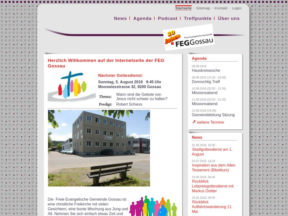 Die Freie Evangelische Gemeinde Gossau ist eine christliche Freikirche mit vielen Gesichtern, eine bunte Mischung aus Jung und Alt. Nehmen Sie sich einfach etwas Zeit und informieren Sie sich auf unserer Homepage über unsere Aktivitäten und über unseren Hintergrund.Herzlich Willkommen!