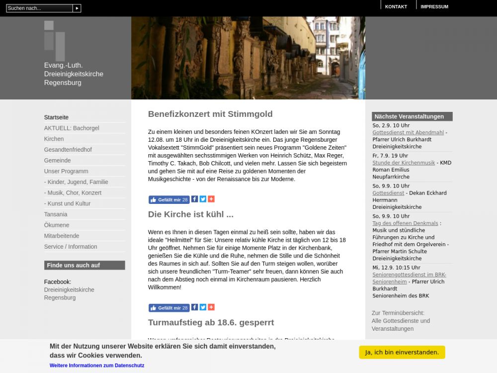 Evangelisch-Lutherische Kirchengemeinde in der Innenstadt von Regensburg. Dreieinigkeitskirche (Am Ölberg 1) erbaut 1631, 2009-2013 komplett innen renoviert. Während der Sommerzeit Möglichkeit, den Nordturm zu besteigen und die herrliche Aussicht über die Dächer der Stadt zu genießen (Eintritt: 2,- Euro). Aufgrund von Corona zeitweise eingeschränkte Besuchsmöglichkeit.Gemeinde-Info