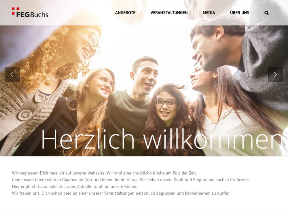 Die Freie Evangelische Gemeinde (FEG) Buchs ist eine christliche Kirche am Puls der Zeit. Gemeinsam feiern wir den Glauben an Gott und leben ihn im Alltag. Wir lieben unsere Stadt und Region und suchen ihr Bestes.Unser Gottesdienst am Sonntagmorgen soll für Jung und Alt ein Höhepunkt der Woche sein. Hier treffen wir uns, um auf Gottes Wort zu hören, mit Gebet und Lied darauf zu antworten und Menschen zu begegnen. Wir gestalten sieden Hauptanlass generationenübergreifend. Die Predigten sollen die Bibel alltagsnah auslegen, so dass Leben verändert werden und Menschen in ihrer Beziehung zu Gott wachsen können.