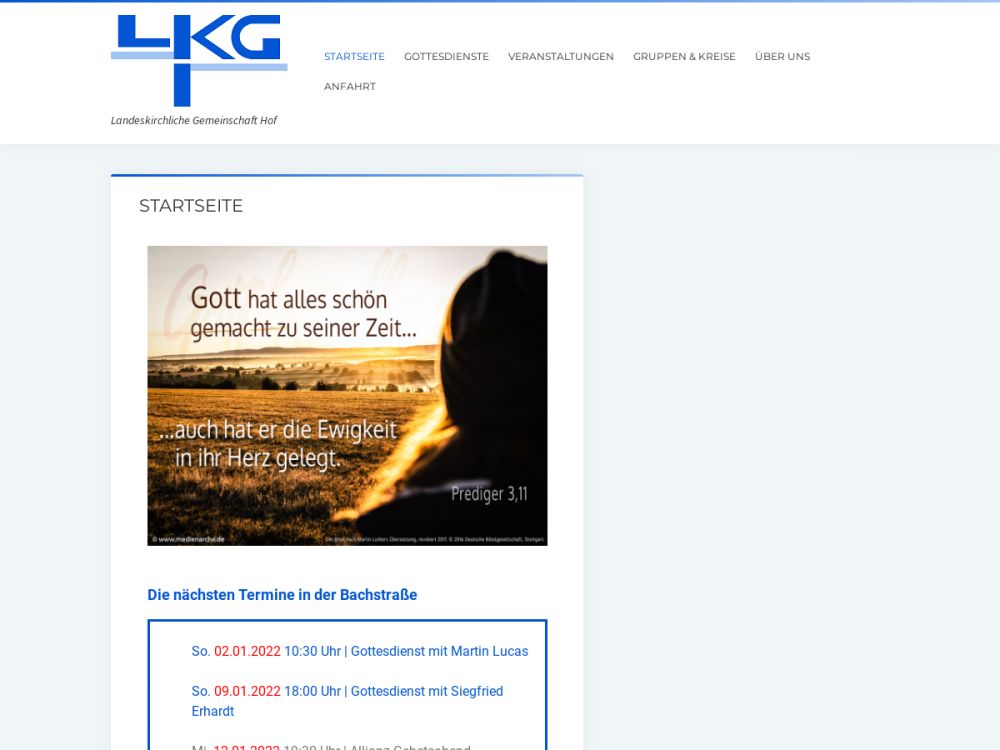 Die LKG Hof gehört zum Landeskirchlichen Gemeinschaftsverband in Bayern e.V. (lkg.de). Dieser ist ein freies, missionarisches und diakonisches Werk innerhalb der Evang.-Luth. Landeskirche in Bayern. Als Glaubensgrundlage hat er die Bibel unter Beachtung der reformatorischen Bekenntnisse und ist mit ähnlichen Gemeinschaften im „Gnadauer Verband“ zusammengeschlossen. Die LKG Hof ist darüber hinaus Mitglied der Evangelischen Allianz Hof (ea-hof.de).Gemeinde-Info