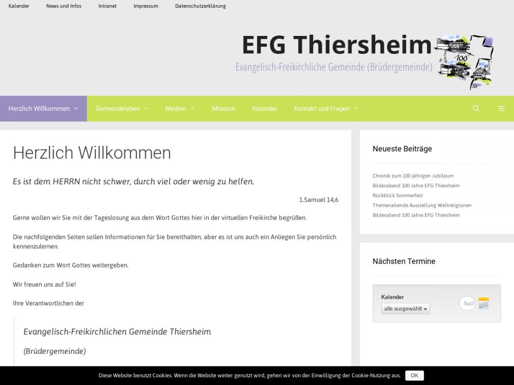 Im Herbst 1918 wurde der erste Schritt zur Entstehung der EFG Thiersheim getan. Zunächst eine sogenannte Stubenversammlung einzelner Christen, die sich in Thiersheim gefunden haben, entstand mit der Vereinsgründung am 1. November 1927 dann eine Ortsgemeinde, die auch dem Staat und der Öffentlichkeit gegenüber legitimiert war und ist. Seit April 1937, als die sogenannte Versammlung von Staats wegen verboten wurde, gehörte unsere Ortsgemeinde zum Bund freikirchlicher Christen und nach dem 2. Weltkrieg dem Bund Evangelisch-Freikirchlicher Gemeinden in Deutschland K.d.ö.R. an.