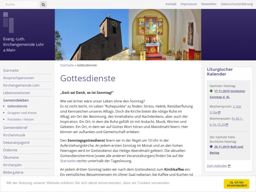 | Gottesdienst: | Sonntag 10.00 Uhr, letzter Sonntag im Monat abends (Zeiten bitte der Homepage entnehmen) |